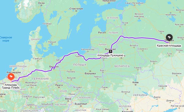 Начальной точкой пути является площадь Гранд-Плейс в Бельгии, транспорт едет через Берлин и Вильнюс, останавливаясь возле Красной площади в Москве.